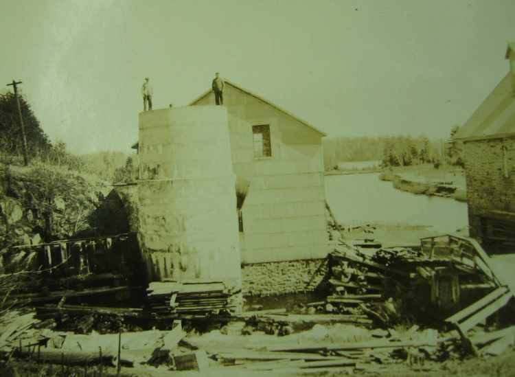 For many years, the sawmill and grist mill at Bedford Mills were operated exclusively by using waterwheels, and lighting was provided by candlelight and later, by coal oil (kerosene) lamps. In 1897, the first hydroelectric plant was built, initially providing DC power for lighting only. It was housed in a small wooden building located at the top of the waterfall, close to the sawmill. The primitive plant supplied light to the mills and buildings at Bedford Mills, but only until 10 p.m. No power was supplied during the night. In 1907, when St. Stephen’s Church was built, a power line was installed to provide lighting for the church. In later years, electricity was utilized to power some of the equipment in the sawmill and grist mill.